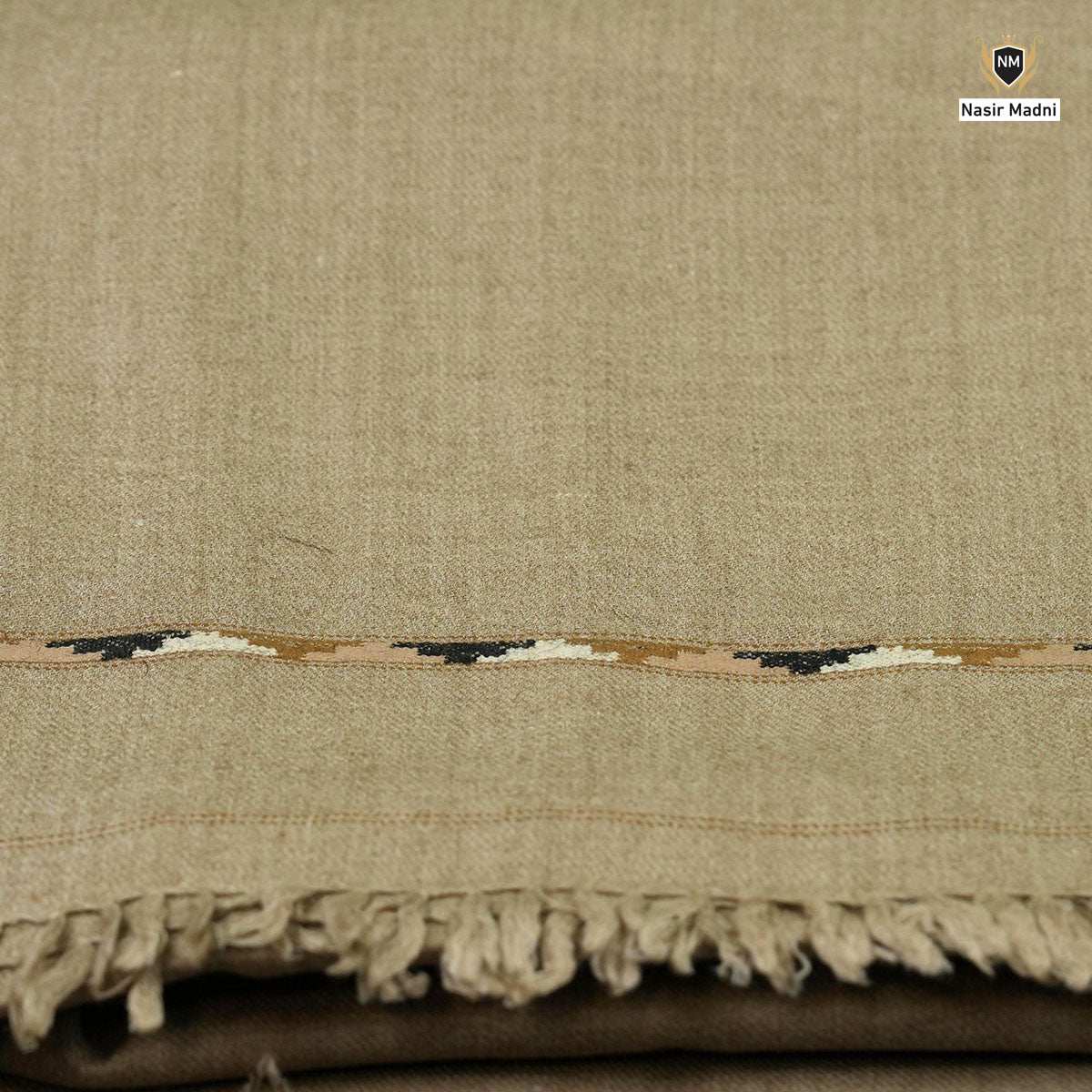 Step into tradition with this pure wool shawl, crafted for warmth, durability, and cultural pride. The light brown base offers a grounded, masculine look, while the zigzag embroidered border in black, white, and brown adds a dynamic touch of heritage. The tight weave ensures lasting comfort, and the fringed edges bring movement and texture to every wear.