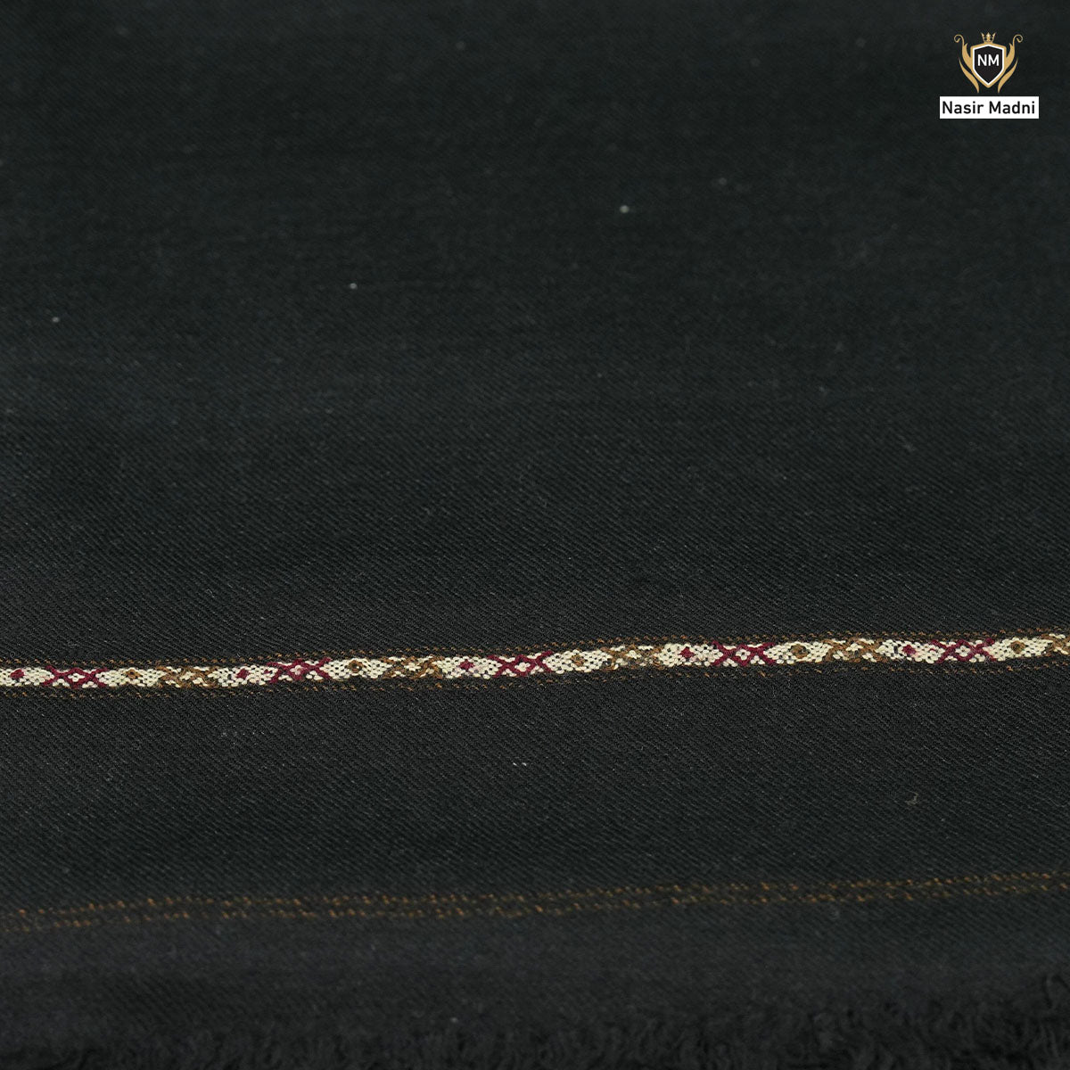 Command attention with this pure wool shawl, crafted for those who appreciate bold tradition and refined craftsmanship. The deep black base offers a sleek, masculine foundation, while the woven border in gold, red, and white adds a regal touch of cultural artistry. The repeating geometric pattern is both classic and eye-catching, making this shawl ideal for formal occasions, Jummah, or winter layering.